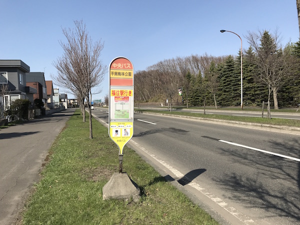 ↑平岡公園入り口近くのシャトルバスのバス停。写真の厚別中央通りを手押し信号で渡ったら、公園の入り口があります。