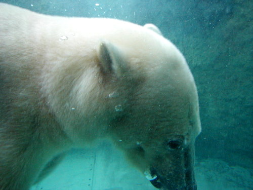 旭川の旭山動物園のホッキョクグマです。水の中で見ると、また、違った動物のようにも見えました。写したのは、2003年です。この年も暑くて、涼しい写真を探して、表紙にしました。 |